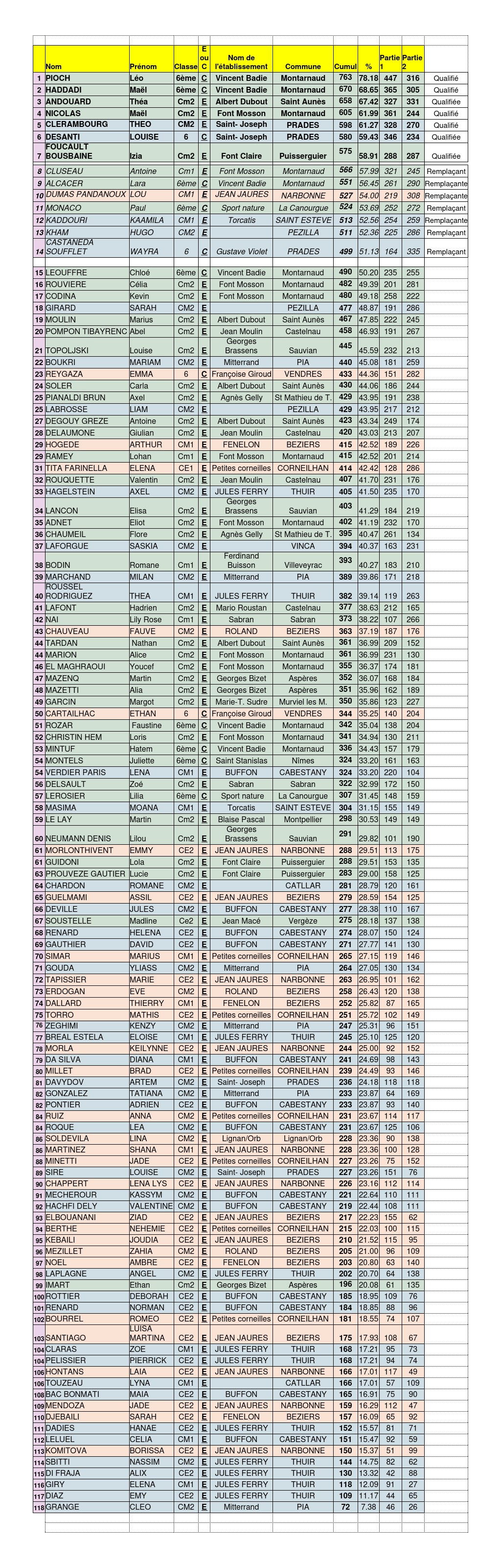 Voici les résultats cumulés (à partir des 3 fichiers envoyés par le délégué régional) mettant en valeur les 7 élèves qualifiés du Comité LR (et leurs remplaçants) pour la finale nationale qui se déroulera le samedi 29 mars à Paris. Sur fond vert les élèves qui ont joué à Montpellier, sur fond bleu les élèves qui ont joué à Prades, sur fond beige les élèves qui ont joué à Béziers.