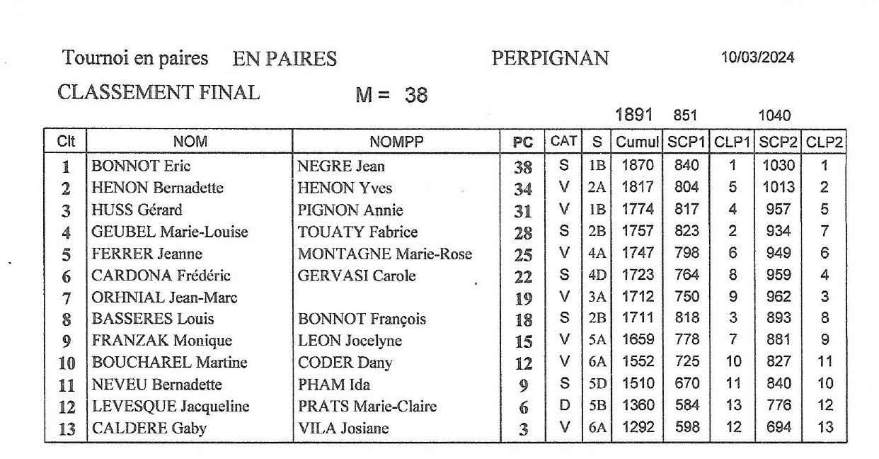 Ce dimanche 10 mars avait lieu le championnat départemental en paires de PO. Il a réuni 25 joueurs des clubs de Perpignan, Saint-Jean-Pla-de-Corts et Villelongue-de-la-Salanque.