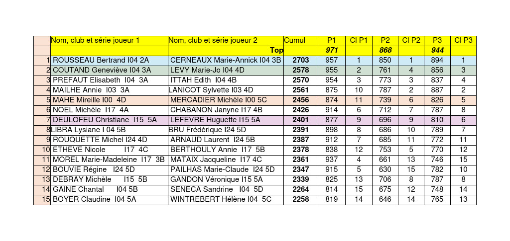 Voici les résultats et les vainqueurs par série qui apparaissent en couleur.