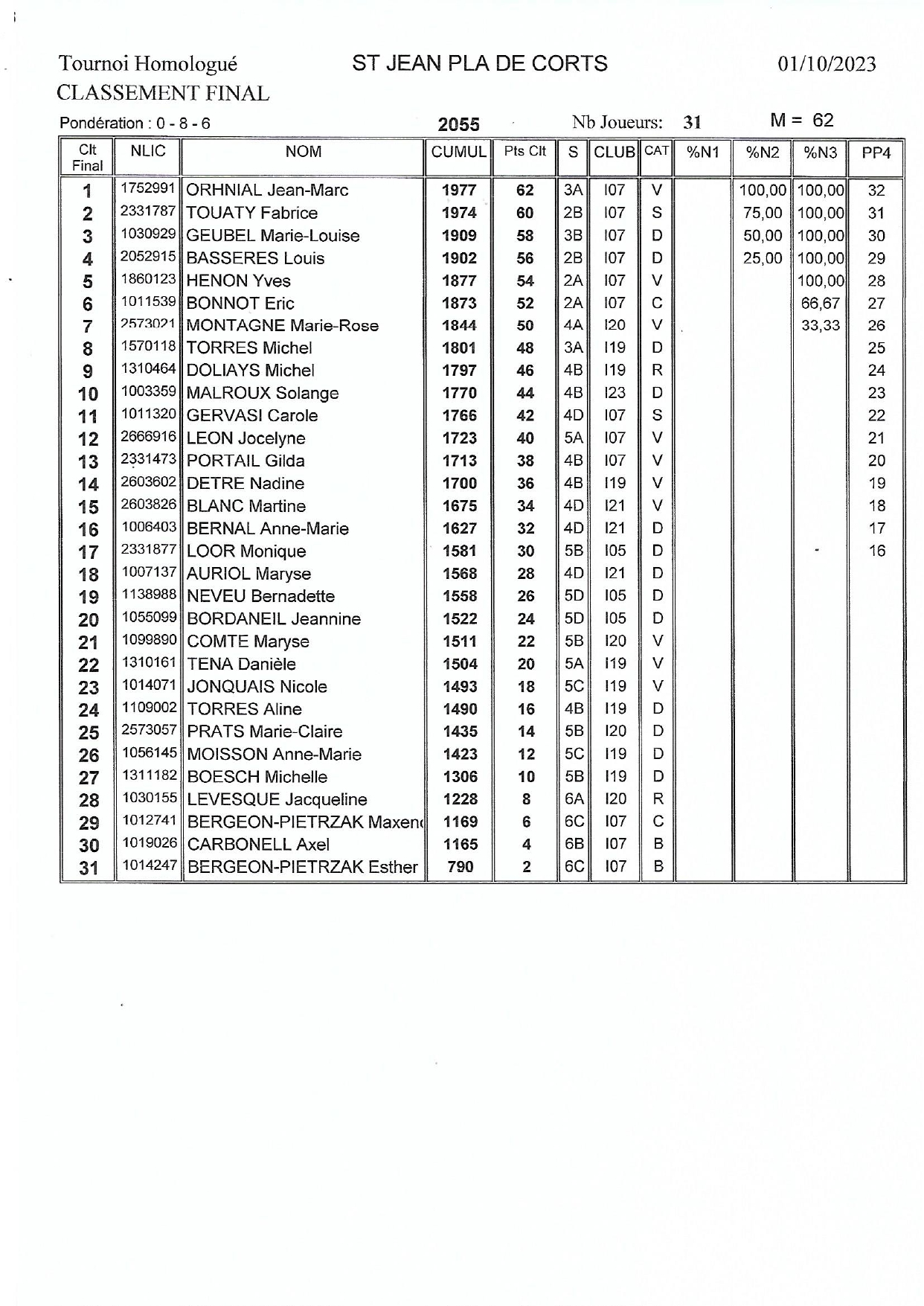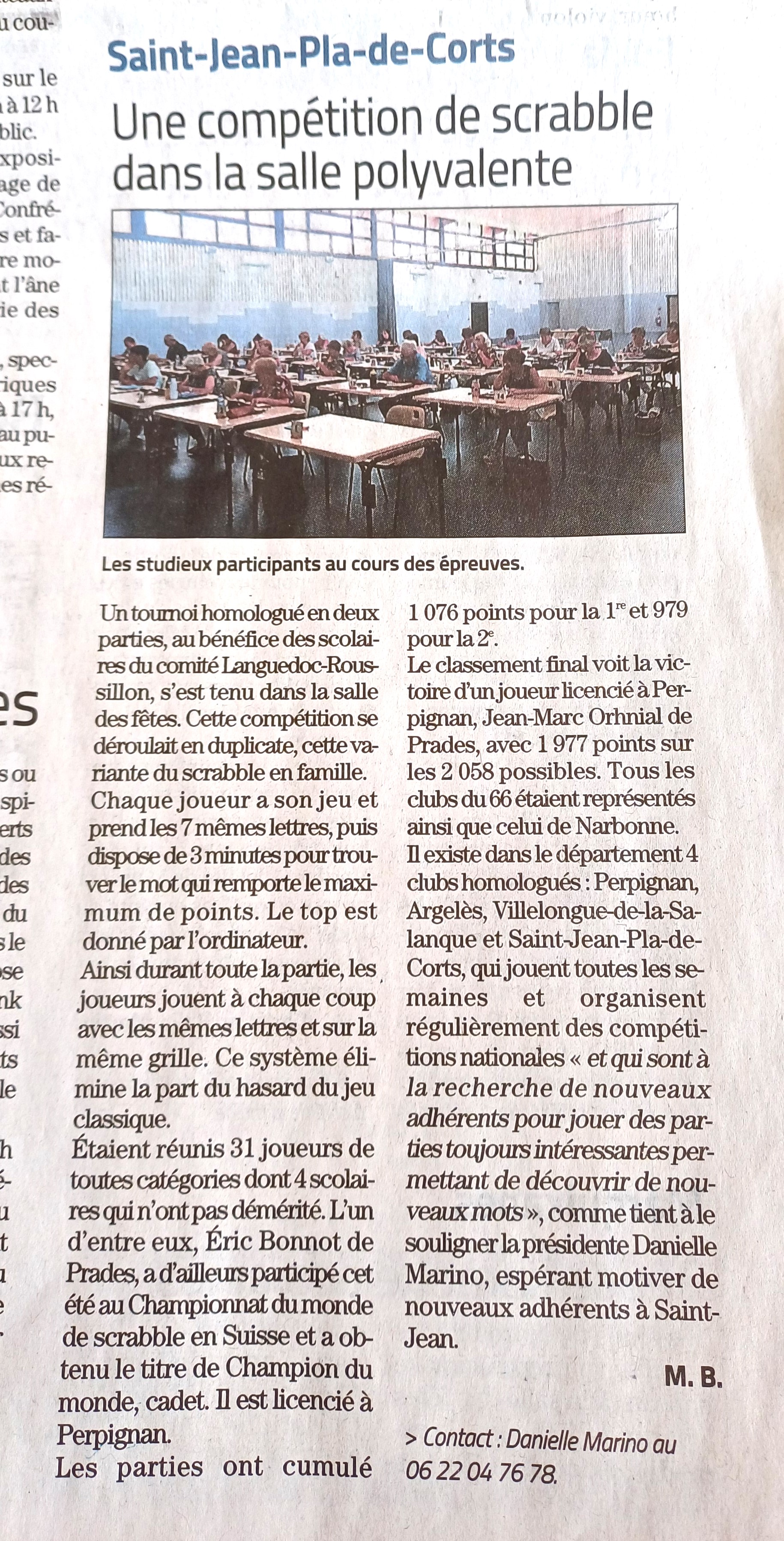 Le tournoi a rassemblé 31 joueurs venus de 6 clubs (Argelès, Argeliers, Narbonne, Perpignan, Saint-Jean et Villelongue). A noter la présence de 4 scolaires qui n'ont pas démérité donc le Pradéen Eric Bonnet, champion du monde Cadet. Compte rendu dans la presse :
