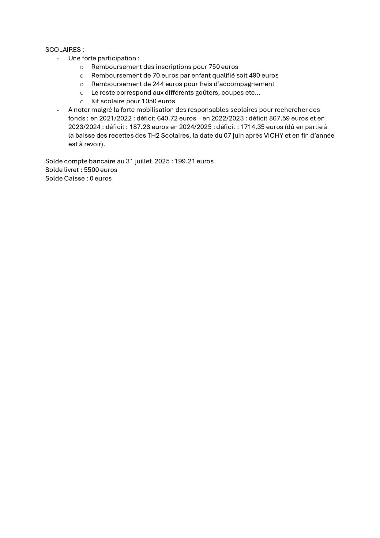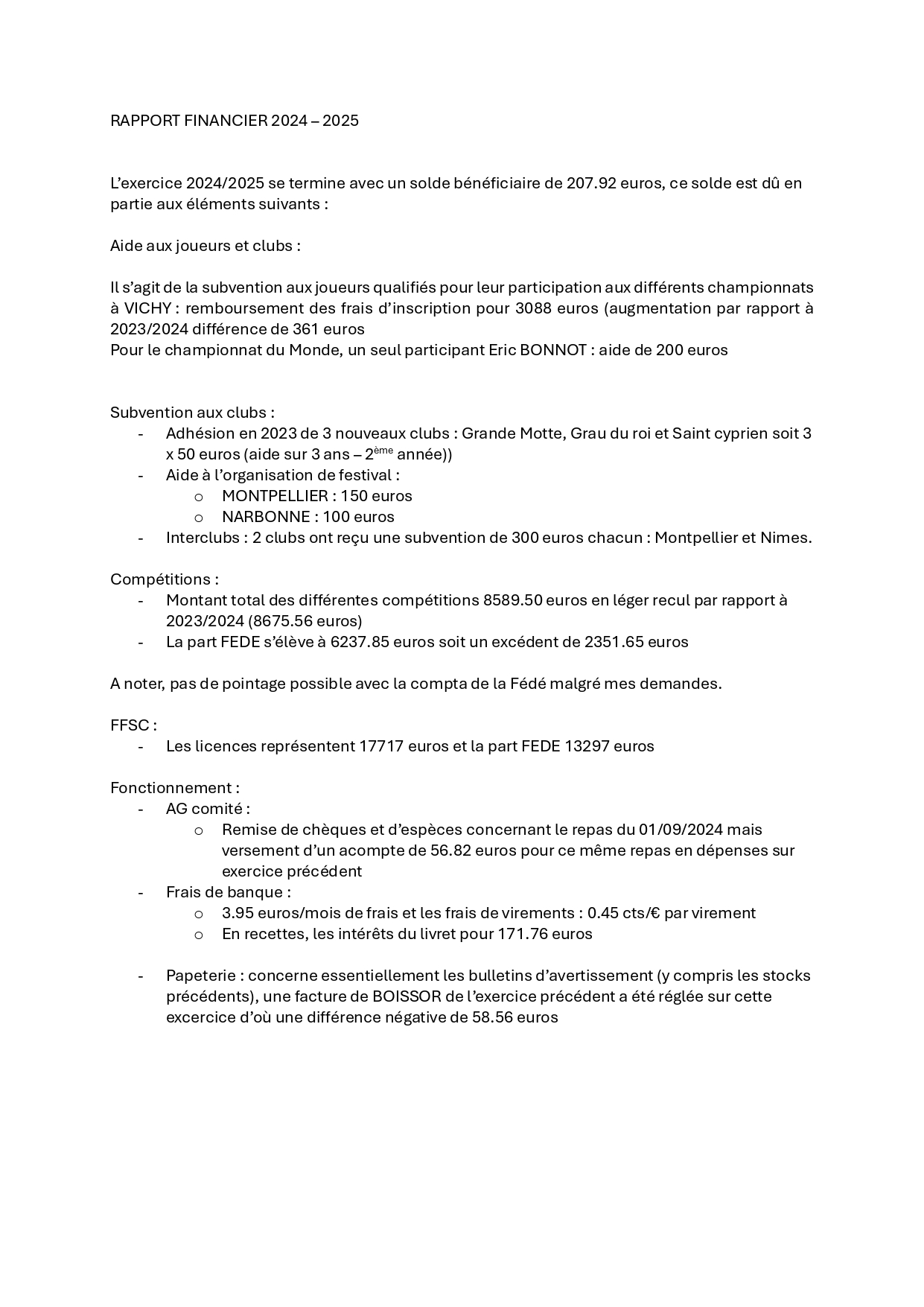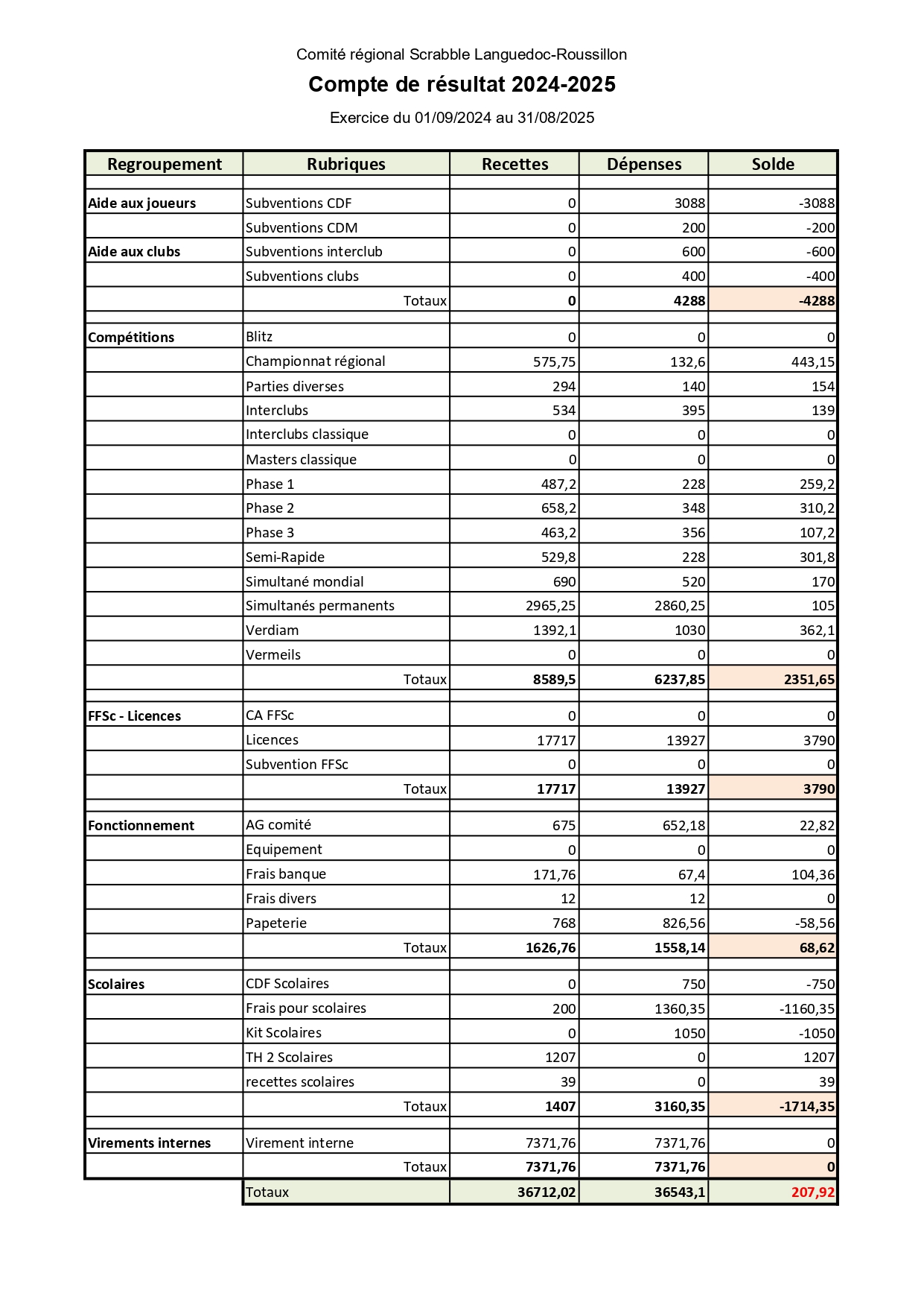 CONVOCATIONL' Assemblée Générale Ordinaire du Comité se tiendra le samedi 30 août 2025 à Béziers, à partir de 10 heures, au Palais des Congrès, 29, avenue Saint-Saëns.Tous les licenciés du comité sont membres de droit de l'Assemblée. Les décisions seront prises à la majorité des membres présents. Il n'est pas prévu de procuration.ORDRE DU JOURRapport moral (G. HUSS)Rapport financier (P. Campourcy) jointScrabble scolaire (JM. Orhnial)Scrabble classique (JY. Costa)Election des 3 représentants du Comité à l'AG de la FFSC à Aix les Bains.Questions diverses.Les personnes volontaires pour représenter le Comité sont priées de faire connaître leur candidature à Cette adresse e-mail est protégée contre les robots spammeurs. Vous devez activer le JavaScript pour la visualiser.. Elles s'engagent bien sûr à participer à l'AG.A l'issue de l'AGO se tiendra une réunion du Conseil d'Administration (membres du bureau et présidents de clubs ou leurs représentants) afin de préparer la saison 2025-2026 et notamment le calendrier prévisionnel (les clubs absents sont priés de me faire connaître leur calendrier de compétition), les subventions accordées aux joueurs et aux clubs, le coût des licences, ... .IMPORTANT ; Il est prévu un repas en fin de matinée au prix de 32 euros dont 5 euros seront pris en charge par le Comité. Les inscriptions sont prises jusqu'au 13 août sur le site du Comité en cliquant ici directement sur le lienLe Président du ComitéGérard HUSS