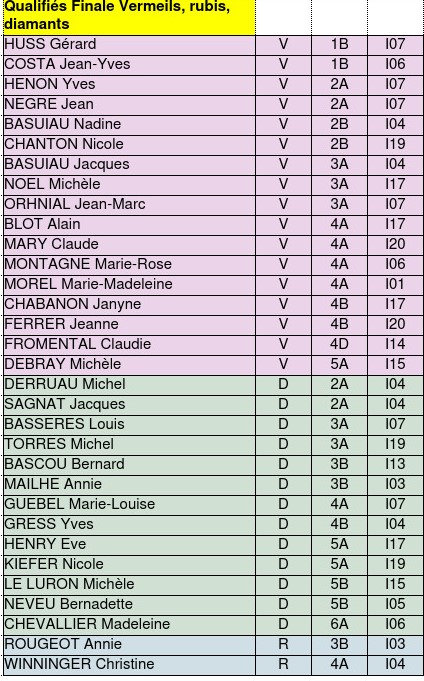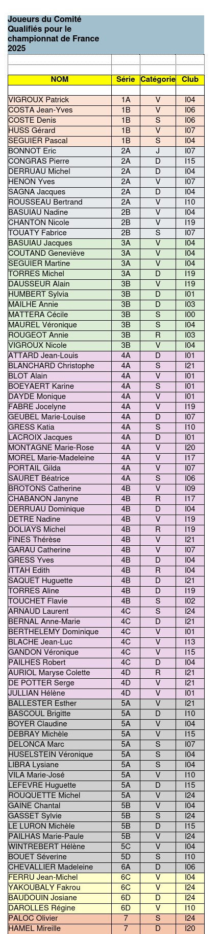 Voici la liste définitive des joueurs qualifiés par séries et par catégories pour les finales des championnats de France à Vichy du 24 au 31 mai 2025 :