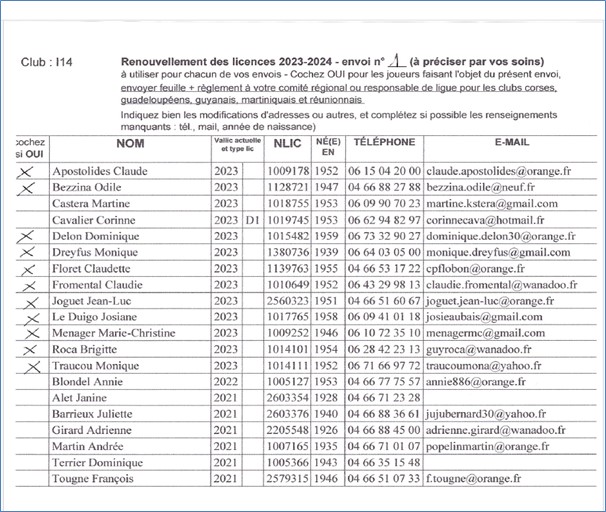 Pour les renouvellements de licences, merci d’utiliser le modèle « Formulaire renouvellement licences club Ixx.pdf » du mailing de rentrée.
