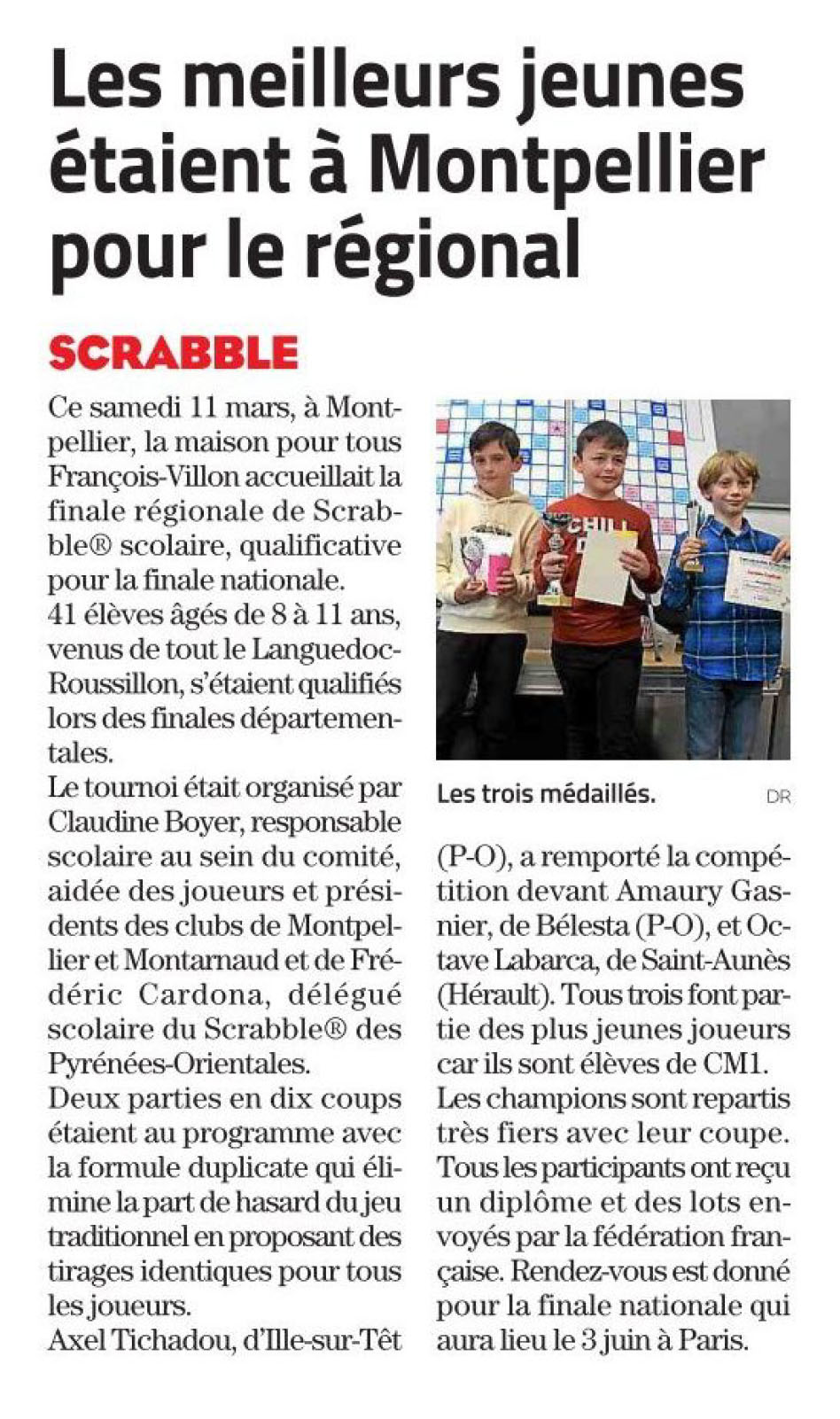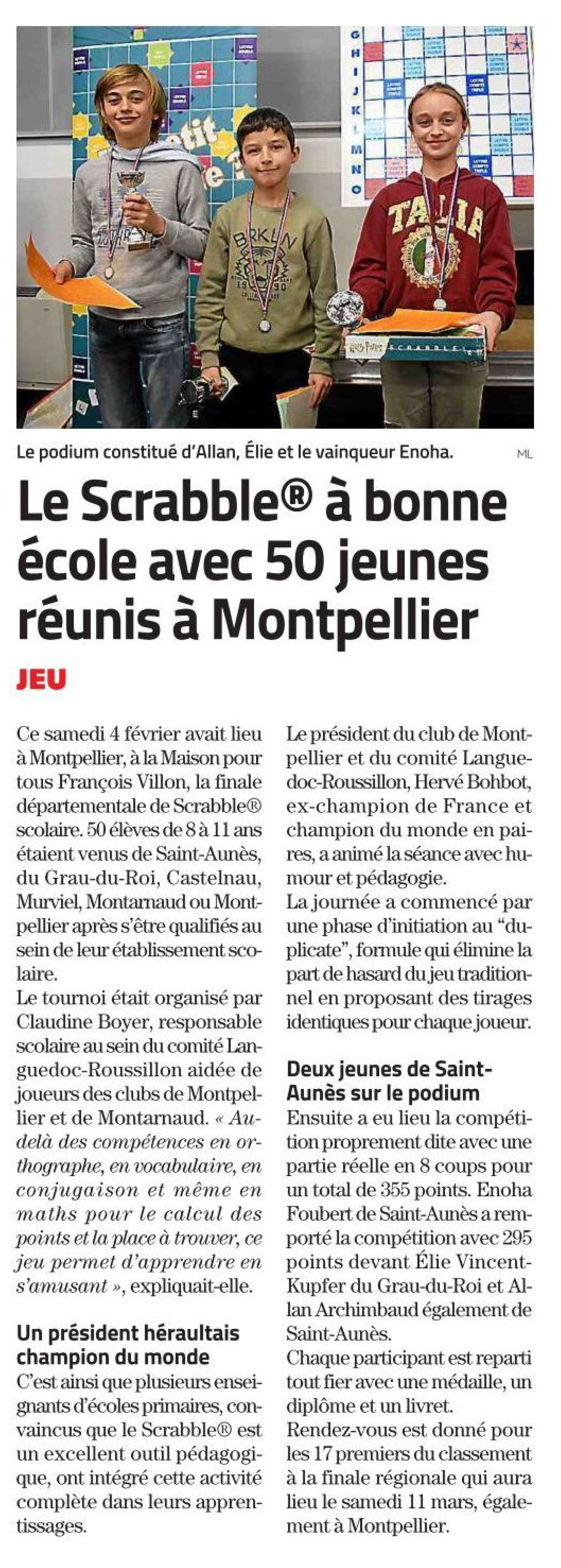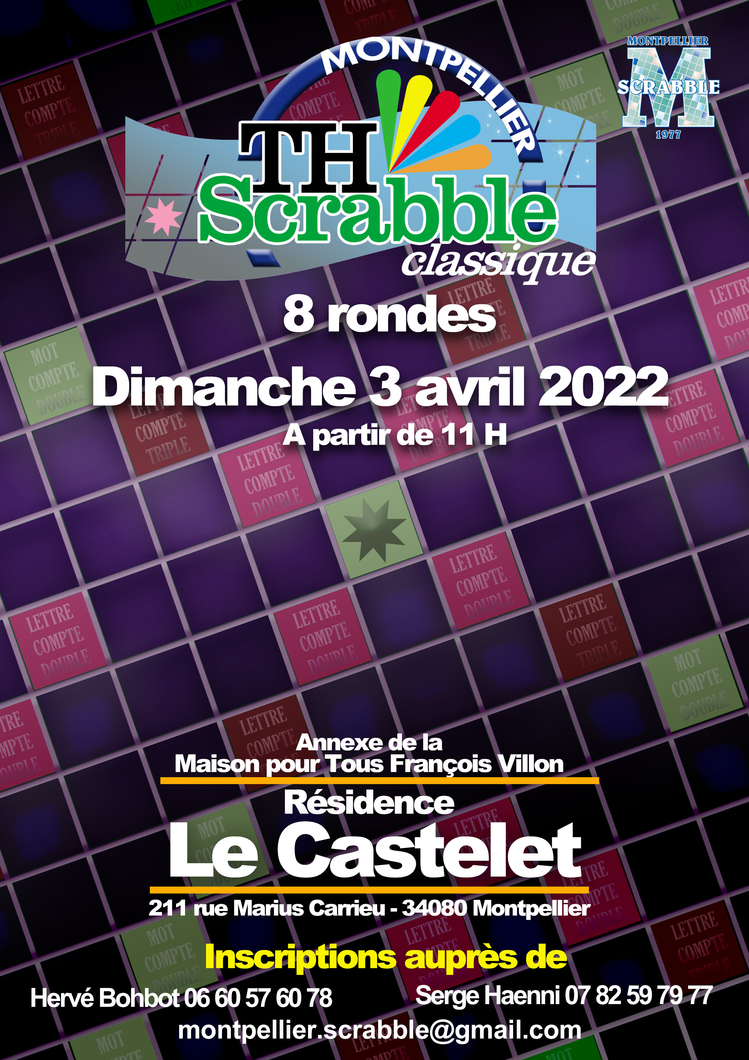 - Chèque bancaire à l'ordre de Montpellier-Scrabble, à envoyer avant le 25 janvier à : Montpellier-Scrabble - App. 87, Bât. E, 51 rue Michel-Ange - 34070 Montpellier.