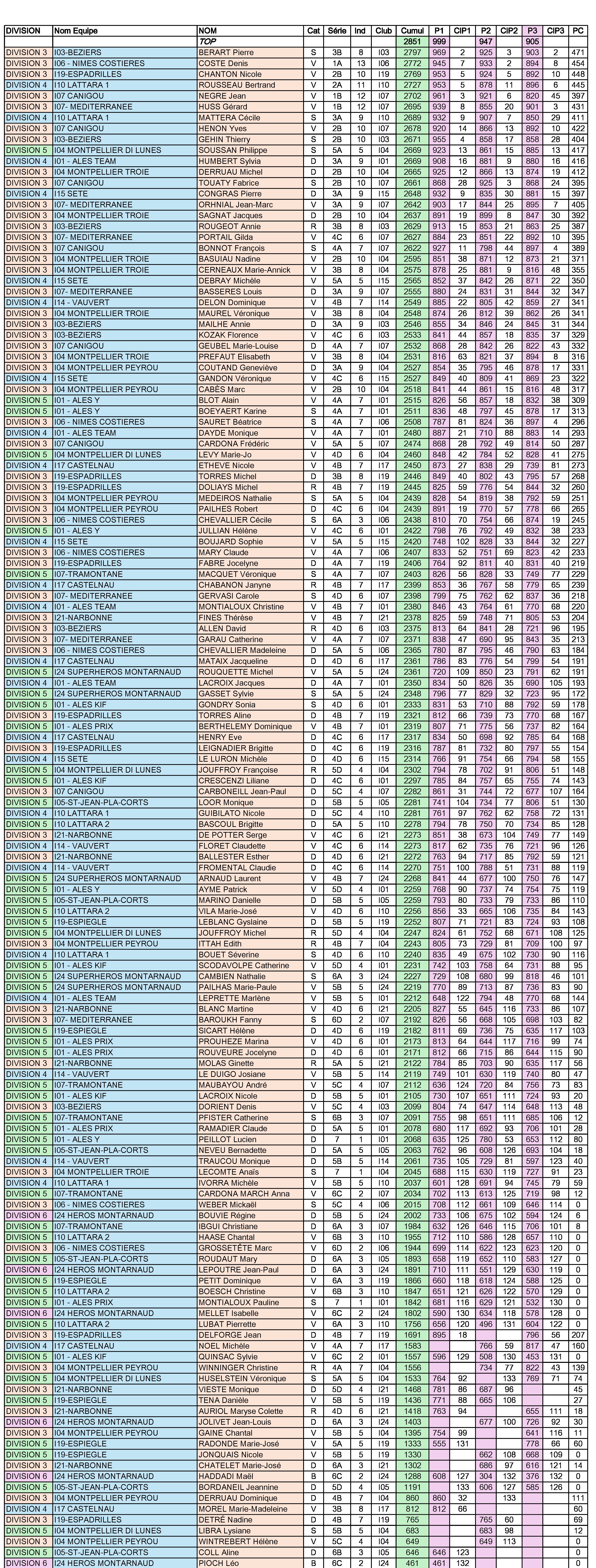 1) les résultats dans l'ordre du Classement par équipes par Division :